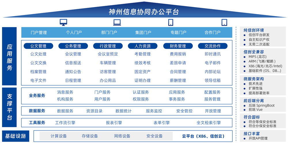 基于微服务应用架构设计的一体化办公平台,,采用前后端分离的开发模式,,支持在龙芯、、鲲鹏、、、飞腾、、兆芯等芯片的国产服务器安装部署,,,,能够为企业提供丰富的协同功能应用,,满足客户多样化、、、、场景化、、个性化的应用需求,,助力中大型与集团企业客户实现数字化转型升级。。。