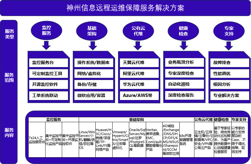 依托7×24小时智能监控中心、、、专业化运维管理平台及资深级技术专家团队,,构建三位一体的远程运维服务体系,,,,提供包括对公有云、、、私有云、、机房、、、、网络、、、、服务器、、、操作系统、、、存储、、、、备份、、、数据库、、、中间件、、、应用、、、、安全等ICT基础设施的远程保障服务。。。为客户数字化转型、、人工智能、、、、云计算、、物联网、、区块链、、、数字资产等前沿技术领域保驾护航,,,驱动客户数字创新进程。。。