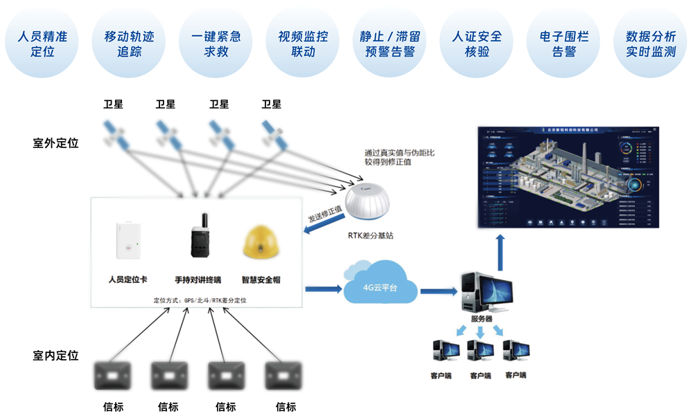 室内室外融合定位技术,,,,确保作业人员、、车辆位置可实时监测,,,及时预警,,,,可有效减少或避免安全事故的发生。。。