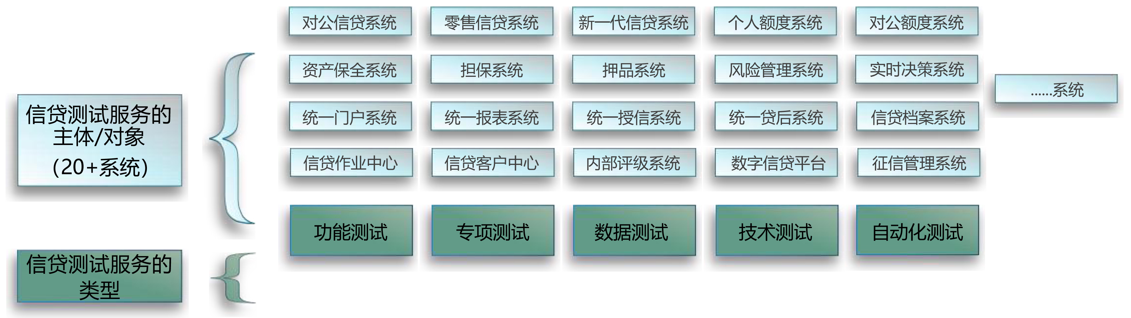 提供全面的测试服务,涵盖新信贷、、、对公/零售信贷等20+信贷类系统,,,,以及功能、、、、性能、、、数据、、、自动化等类型测试。。